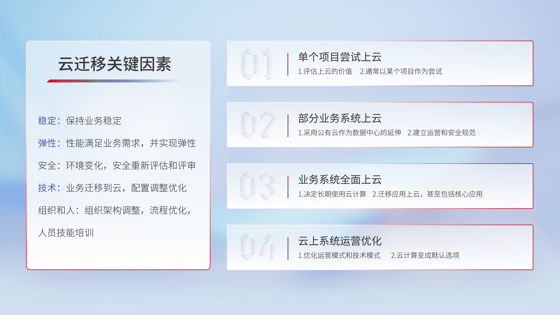 结合实际业务,,,从规划设计、、、、云平台选型、、、云原生改造、、数据迁移、、、集成交付,,,迁移全过程为客户识别最佳上云路径,,,,做好风险识别管理,,,设计网络架构、、身份权限、、安全审计合规、、操作审计、、日志审计、、、监控告警策略、、、多站点容灾设计等,,,对云上基础设施进行整体规划,,提升IT治理水平,,以满足弹性、、高可用、、、、高性能的需求。。。