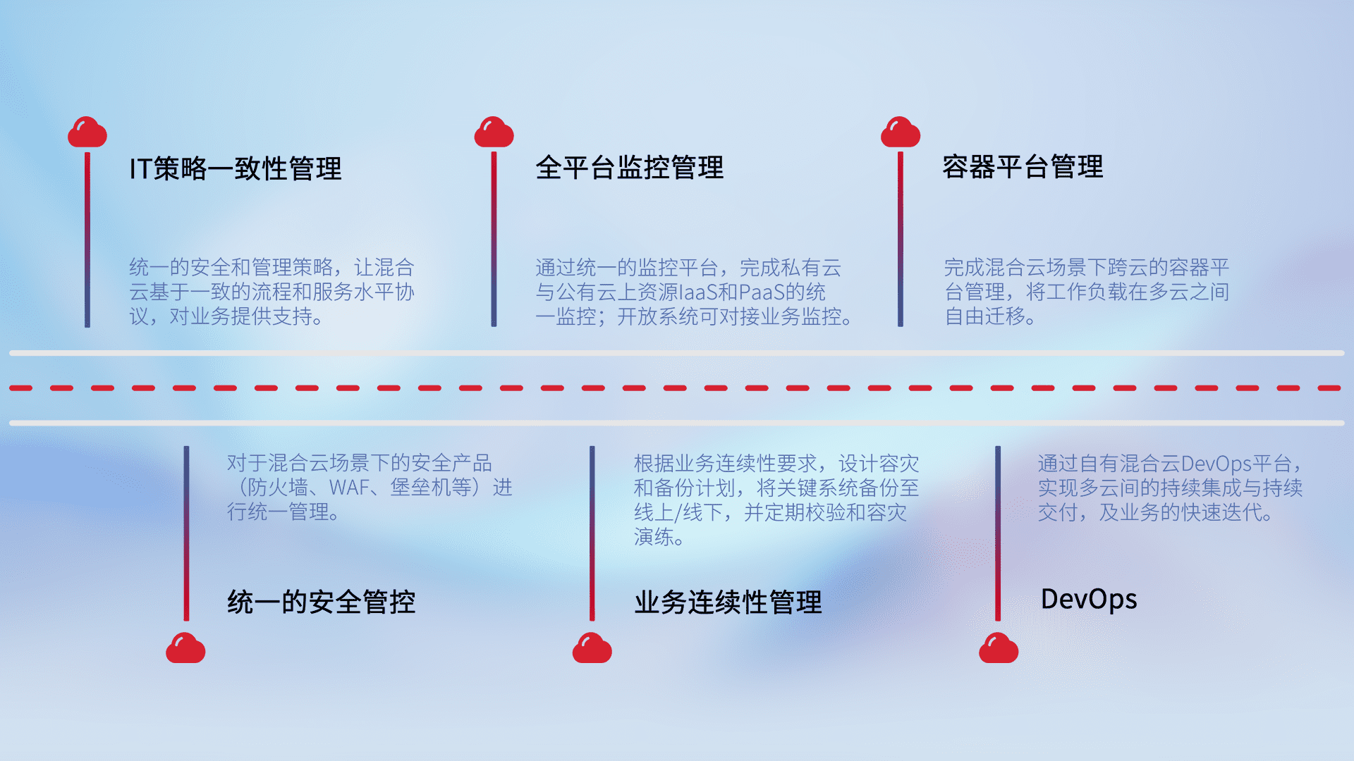 通过多云纳管,,,以统一的资源数据模型把客户的云资源进行抽象和封装,,,,进而实现对多云资源的统一操作,,,保障云资源管理的可靠性、、、稳定性与可用性。。。。量身定制化运维内容,,,配置、、开发运维、、、补丁管理、、、、备份、、监控、、认证和访问管理、、、审计和日常巡检等,,保障在用云过程中的可靠度,,,稳定度以及高可用率。。。