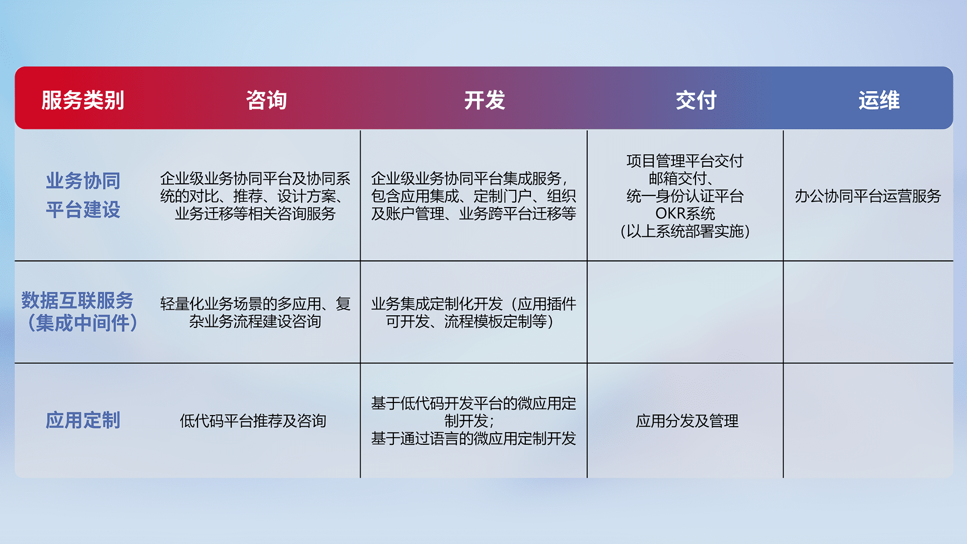 针对钉钉、、企微、、、、IDaas等平台级产品提供产品的规划、、、、方案、、、交付、、定制化开发等服务,,,实现如统一协同办公、、、、智能客户服务、、混合会议管理、、、、智能数据查询、、等业务场景,,,,实现数字化转型。。。。